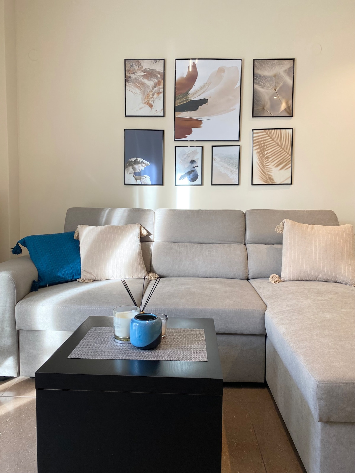 Apartamento totalmente equipado en el tercer piso , decorado personalmente con un estilo artístico yúnico. Hermosas vistas del mar ! -El piso se encuentra a 8 km del centro de la ciudad, a 8 km del aeropuerto de Tesalónica y a 50 metros del lado del mar. - Un dormitorio con una cama de tamaño completo y un relajante colchón de primera calidad. - 1 sofá cama en la sala de estar. - Te proporcionamos todo lo esencial para garantizar una estancia agradable, como lavadora, armario grande, altavoces de alta calidad, etc. - Las mascotas son bienvenidas también