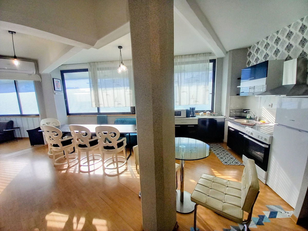 The Loft Apartment is located in the most beautiful area of Thessaloniki, in Kalamaria - 50 m from the sea - 10 min from the city center - 10 min from the airport Steps away from restaurants , cafes , bars, sandy beach, the yacht marina, sailing & rowing clubs the apartment features: - A wide open room with balcony - An equiped kitchen - A modern bathroom - 1 double bed - 1 double sofa bed - Welcome amenities - High speed internet - Free parking - Smart TV with Netflix - A/C