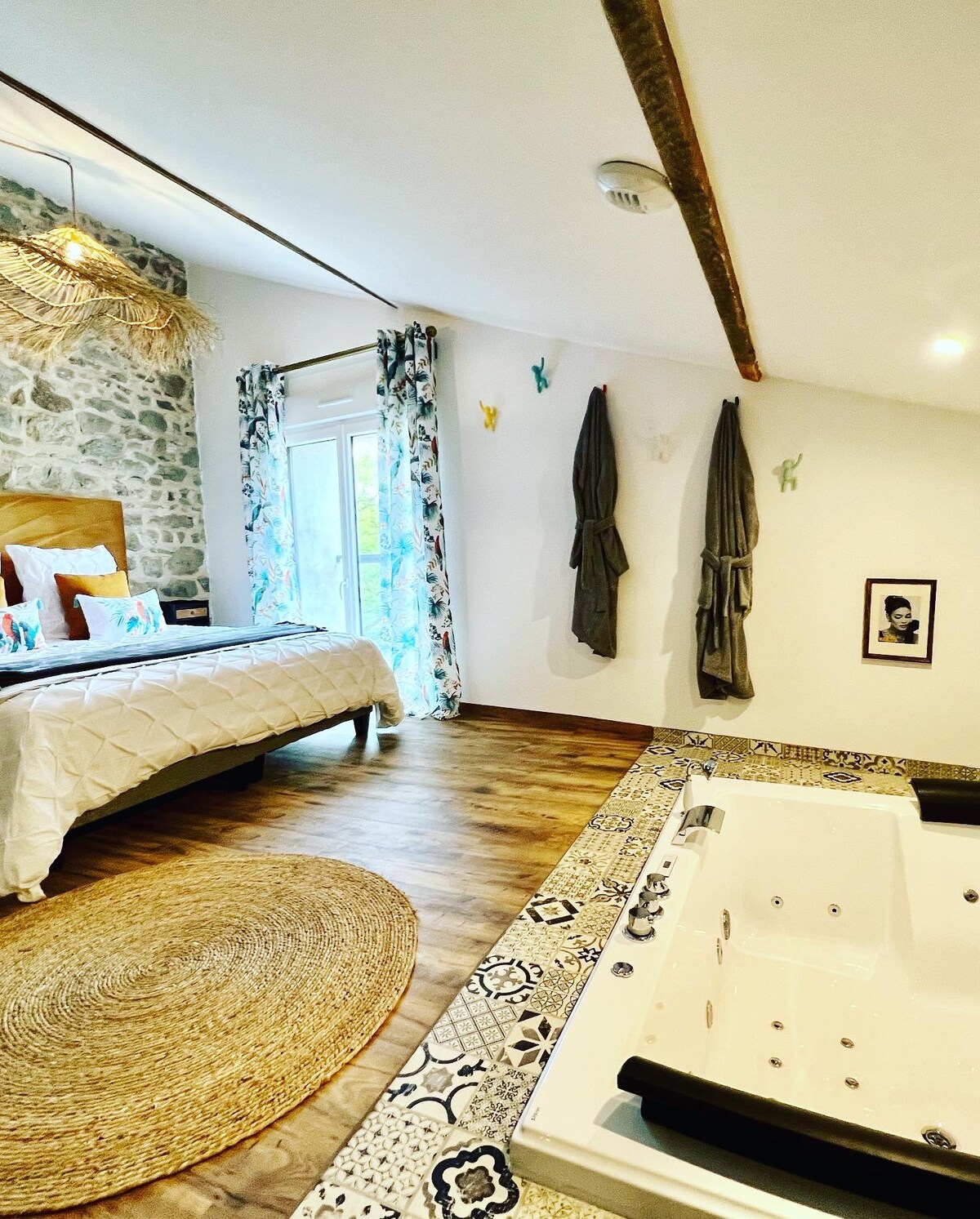 Una invitación a viajar, exótica y única, en un ambiente acogedor y natural donde la madera y los materiales naturales son omnipresentes, esto es lo que define nuestra pequeña cabaña confidencial. En su terraza, su jacuzzi privado le invita a relajarse en agua a 37 °C y disfrutar de una vista privilegiada de la naturaleza. La pequeña cabaña se convierte en un pequeño chalet de montaña desde el 1 de noviembre hasta mediados de marzo… Será un placer recibirte.
