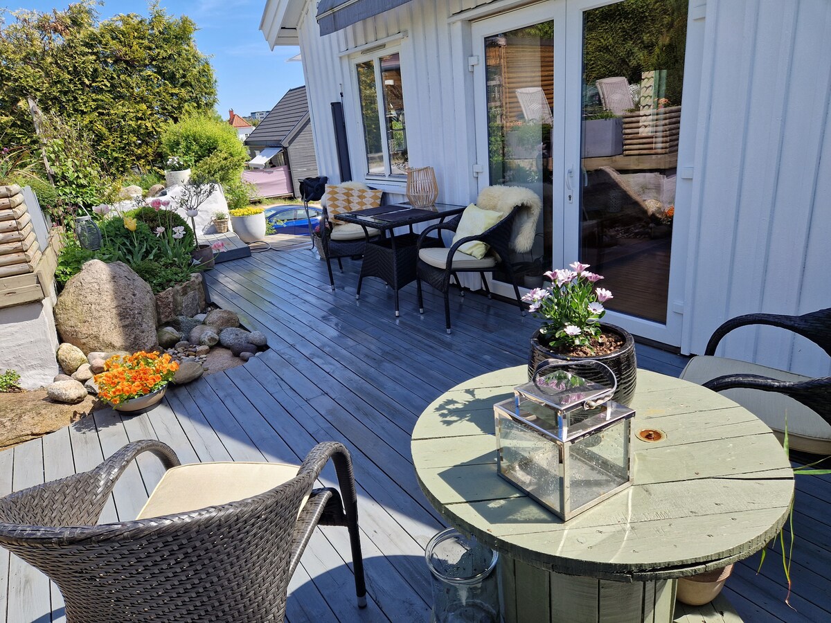 La propiedad se encuentra junto al mar, en Galtö, de camino a Resö. Justo entre Strömstad y Grebbestad. La casa de invitados con vistas al mar está en nuestra propiedad a unos 50 metros del mar. A una distancia de tres millas hay cuatro campos de golf. Galtö también ofrece excelentes aguas de pesca para truchas marinas y fantásticos paseos por el bosque. Desde la terraza puedes disfrutar de las vistas al sol y al mar. Mi casa es ideal para parejas, golfistas, pescadores con mosca. También se da la bienvenida a un perro.