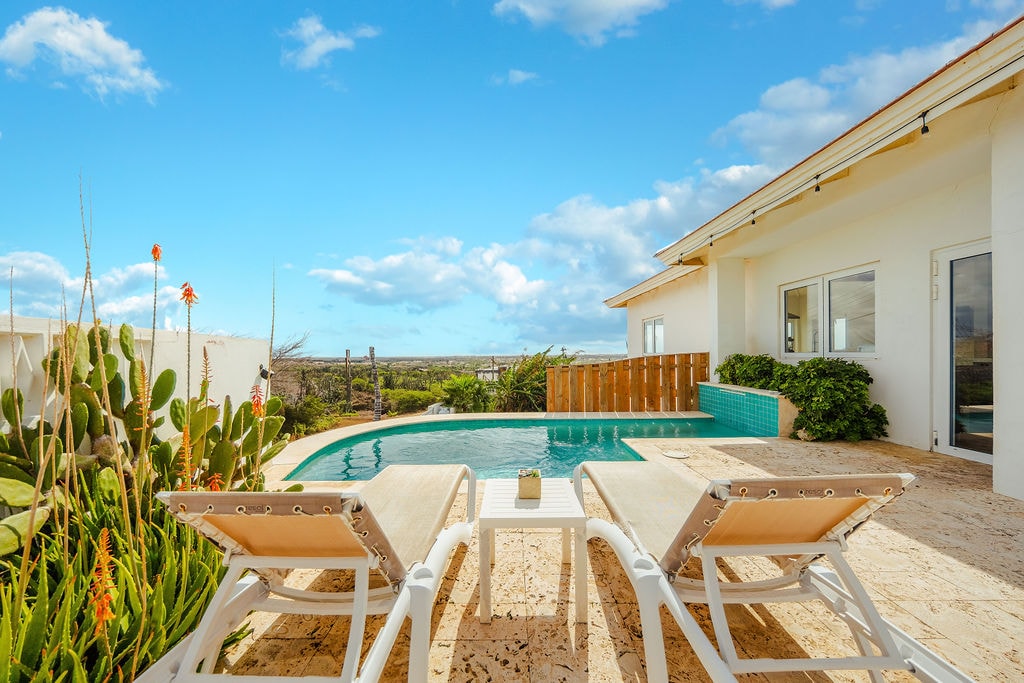 Nuestra casa de campo se encuentra en la isla caribeña de Curazao. La casa está situada en la ladera de una colina, lo que ofrece una hermosa vista panorámica de las colinas circundantes. Todo esto se encuentra en las mismas instalaciones que nuestra propia casa. Cuenta con un dormitorio con aire acondicionado, una pequeña cocina, un baño con agua tibia, una sala de estar, un porche elevado y una pequeña piscina.
