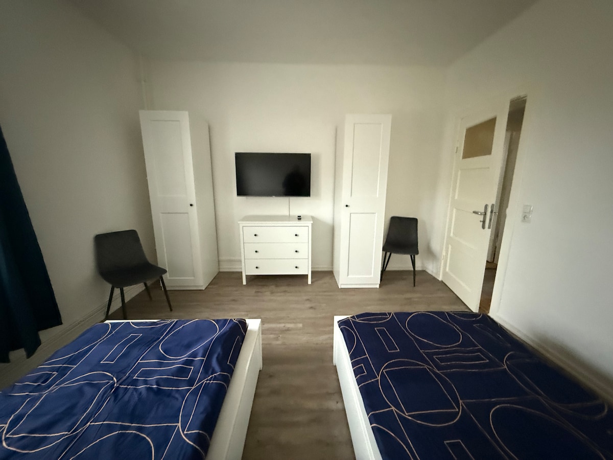 Experimenta un estilo incomparable en 90 metros cuadrados en la suite Mokka Neumünster, a pocos minutos del centro outlet de diseño, la estación de tren y el Holstenhallen. Dos dormitorios con camas de somier garantizan noches relajantes, el baño con ducha emana encanto moderno con acentos negros. Una cocina totalmente equipada y un televisor inteligente garantizan una estancia cómoda. Estacionamiento privado disponible. Ubicación (en minutos) Designer Outlet Center: 5 Estación de tren: 3 Holstenhallen: 7 Hamburgo y Kiel: 35