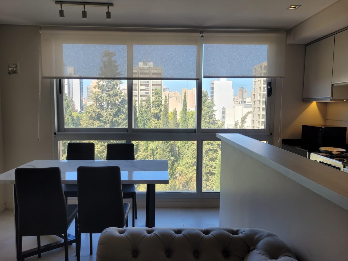 Alojate en el corazon de Neuquen Capital, departamento centrico nivel gerencial a estrenar, luminoso y con una vista inigualable! Privacidad total. A solo 3 cuadras de la avenida principal de nuestra ciudad. Disfruta de tu estadía, te brindamos todas las comodidades para que te sientas como en tu hogar. Cocina totalmente equipada, blanqueria a disposición, equipamiento para planchado, Wifi individual, Aire acondicionado, Smart TV, terraza con parrilla a disposición. Te esperamos!