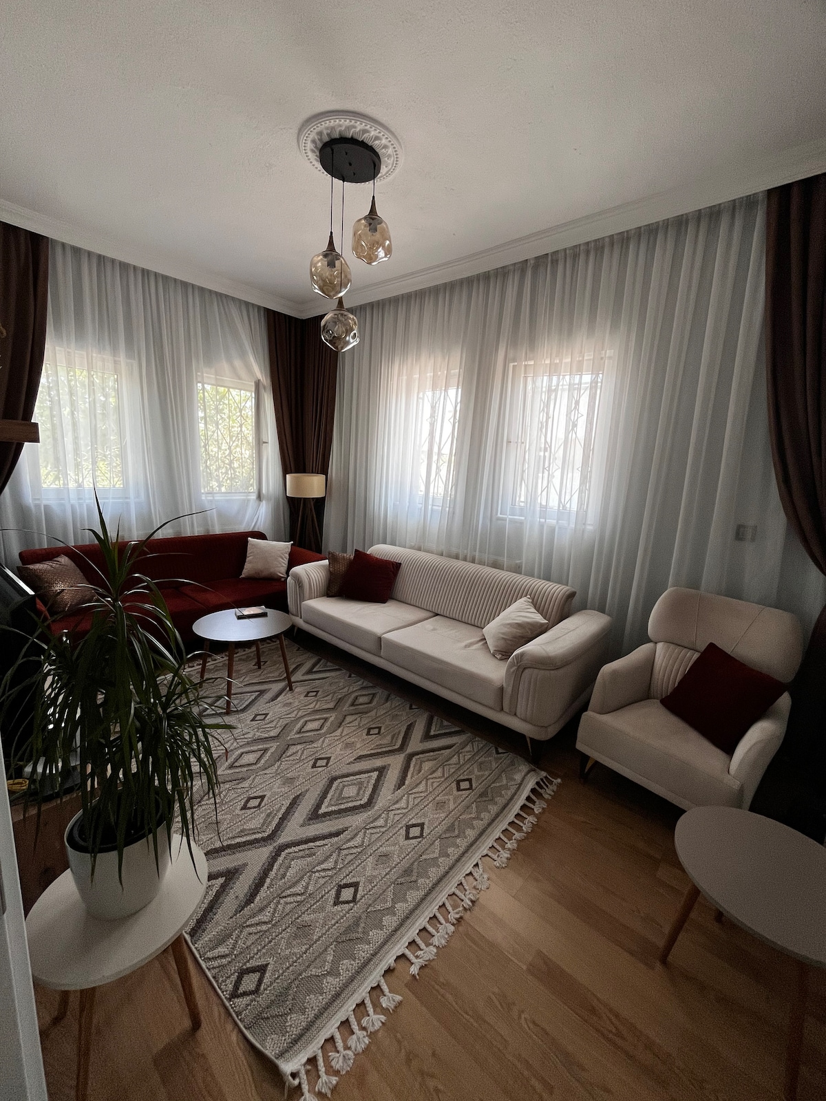 Hogar cálido y cómodo en el centro de Capadocia. Aproximadamente 110 m² con 3 dormitorios independientes, ideal para hasta 6 huéspedes. Salón amplio con auténtico confort de hogar. Tiendas, transporte y servicios diarios muy cerca. Para ver globos aerostáticos, el Valle Rojo (Kızılçukur) y Zindan Hill están a poca distancia a pie, los mejores miradores.