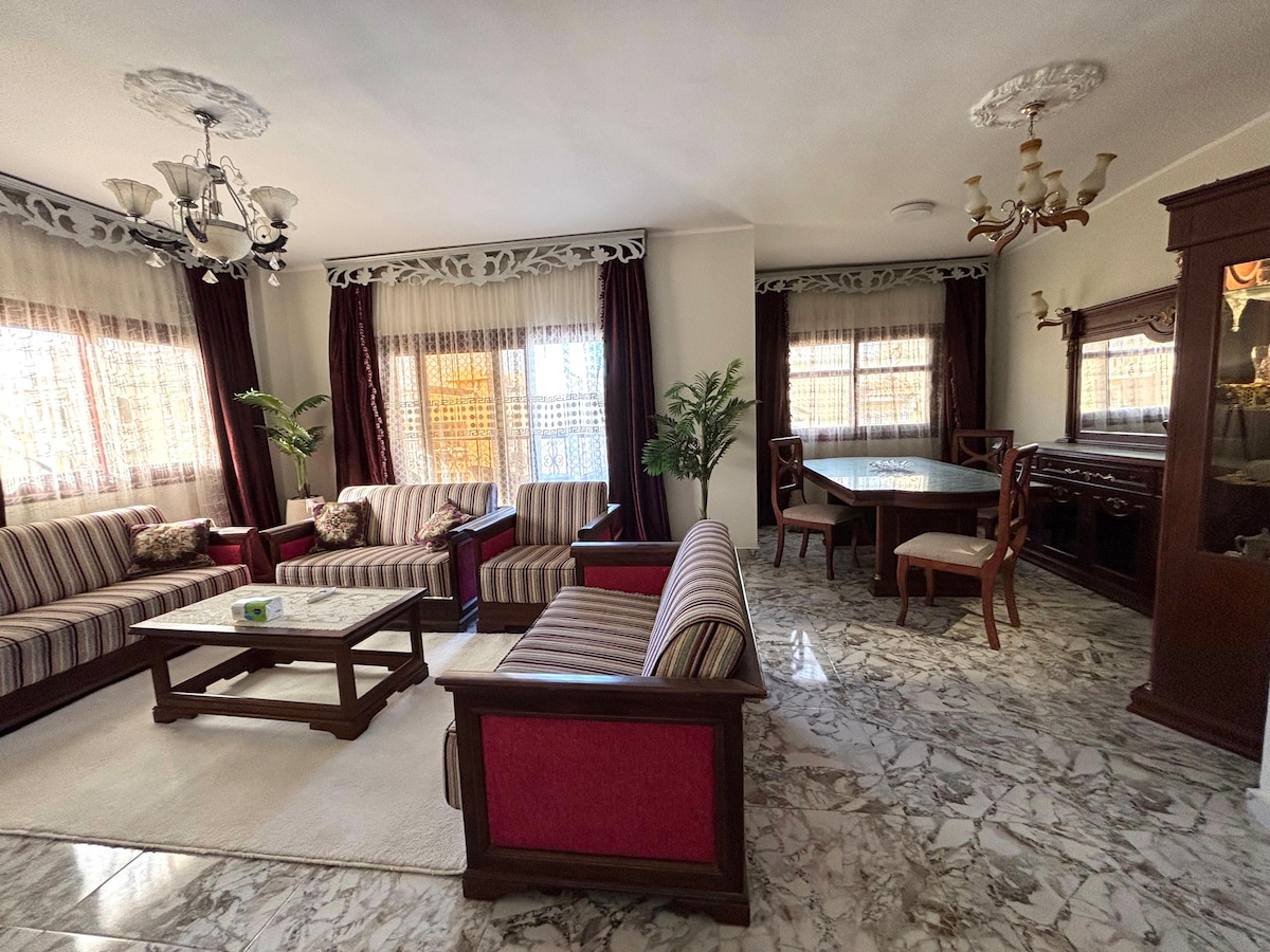 Disfruta de una experiencia elegante en este lugar céntrico. Ofrecemos asistencia gratuita para el equipaje 🧳. A 3 minutos en coche de Al Rehab y a 1 minuto a pie del complejo Garden 8. Restaurantes internacionales, supermercados, bares y farmacias están a 1 minuto a pie. La privacidad está garantizada con la llegada autónoma Estamos encantados de darte la bienvenida a nuestra unidad en el cuarto piso de nuestro encantador edificio. Si bien no hay ascensor, puedes estar seguro, nuestro representante dedicado estará disponible para ayudarte con tu equipaje.