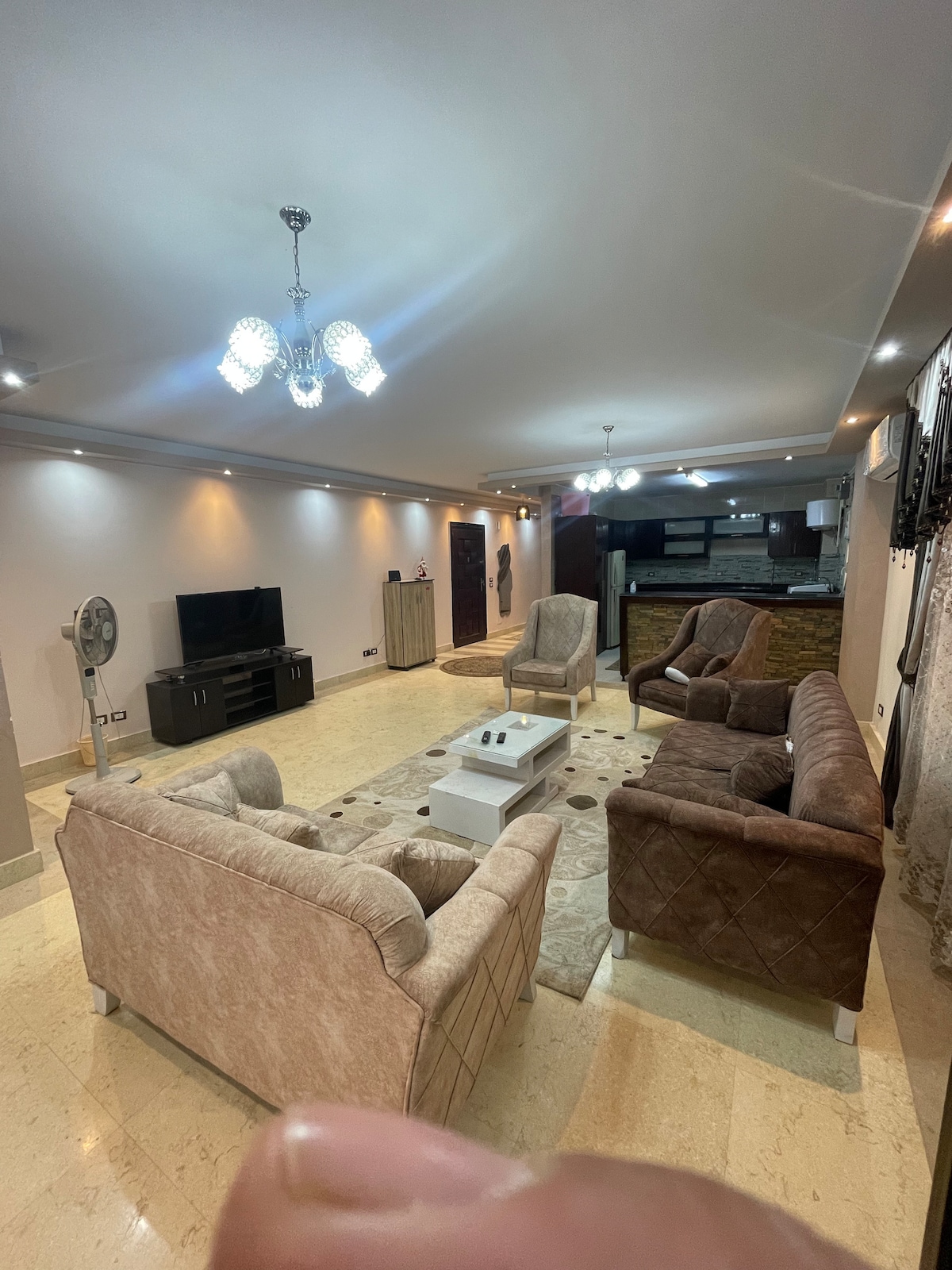 Disfruta de una experiencia elegante con vistas panorámicas a la azotea, cocina moderna y fresca, baño limpio y un televisor grande con Netflix Y 3 aires acondicionados Ubicado en el nuevo Cairo a 5 minutos de AUC y cerca de Hyper market a 5 minutos donde puedes encontrar de todo, desde alfileres hasta cohetes. KFC, Mac, farmacia y otros servicios. A 5 minutos del parque ElMalahy, donde puedes divertirte y jugar. A 30 minutos del aeropuerto. A 35 minutos del río Nilo A 45 minutos de las pirámides y el Gran Museo Egipcio.