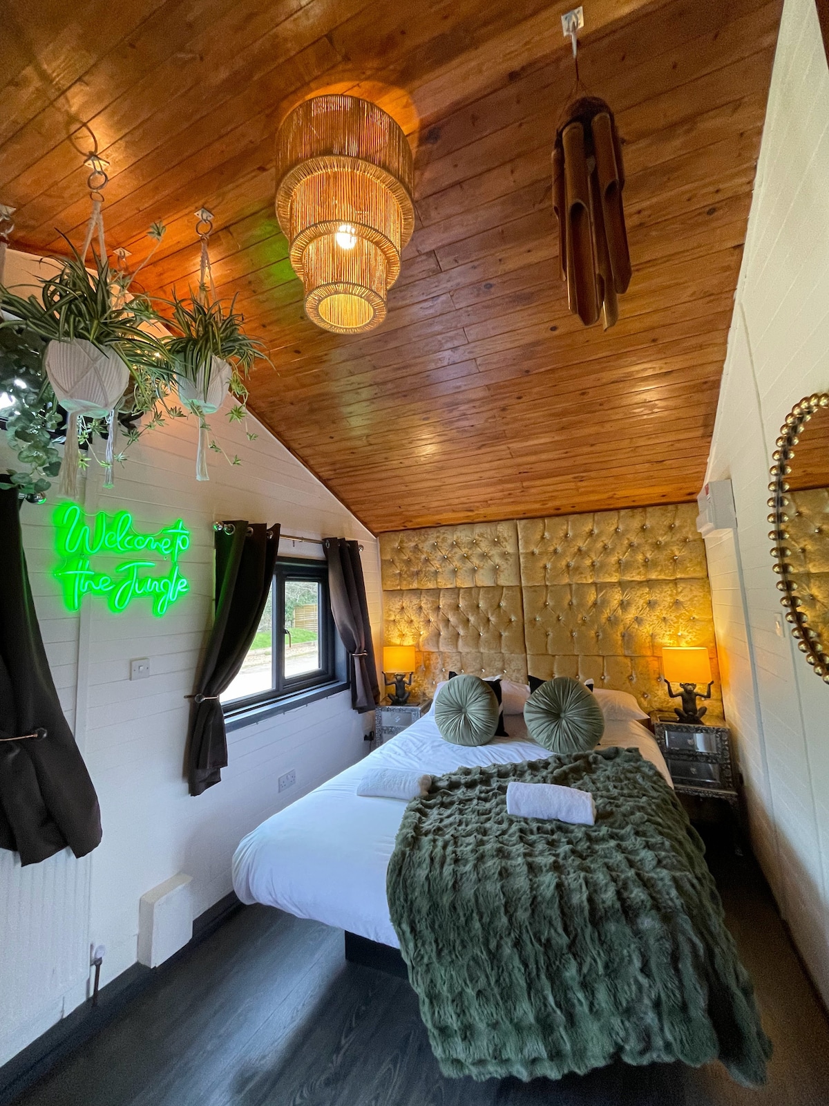 Galardonado, 5 estrellas 2 dormitorios, 2 baños cabaña de madera con bañera de HIDROMASAJE privada (capacidad para 4 personas). Situado en el centro de un campo de golf de campeonato de 18 hoyos a solo 3 millas del centro histórico de Winchester. Los techos abovedados y la madera a la vista proporcionan un entorno tranquilo. Cocina totalmente equipada, sala de estar-comedor de planta abierta con una acogedora chimenea, televisor inteligente con servicios de streaming. La sala de estar se abre a una terraza privada con BAÑERA DE HIDROMASAJE y vistas al putting green de los huéspedes, antiguos bosques y senderos naturales.