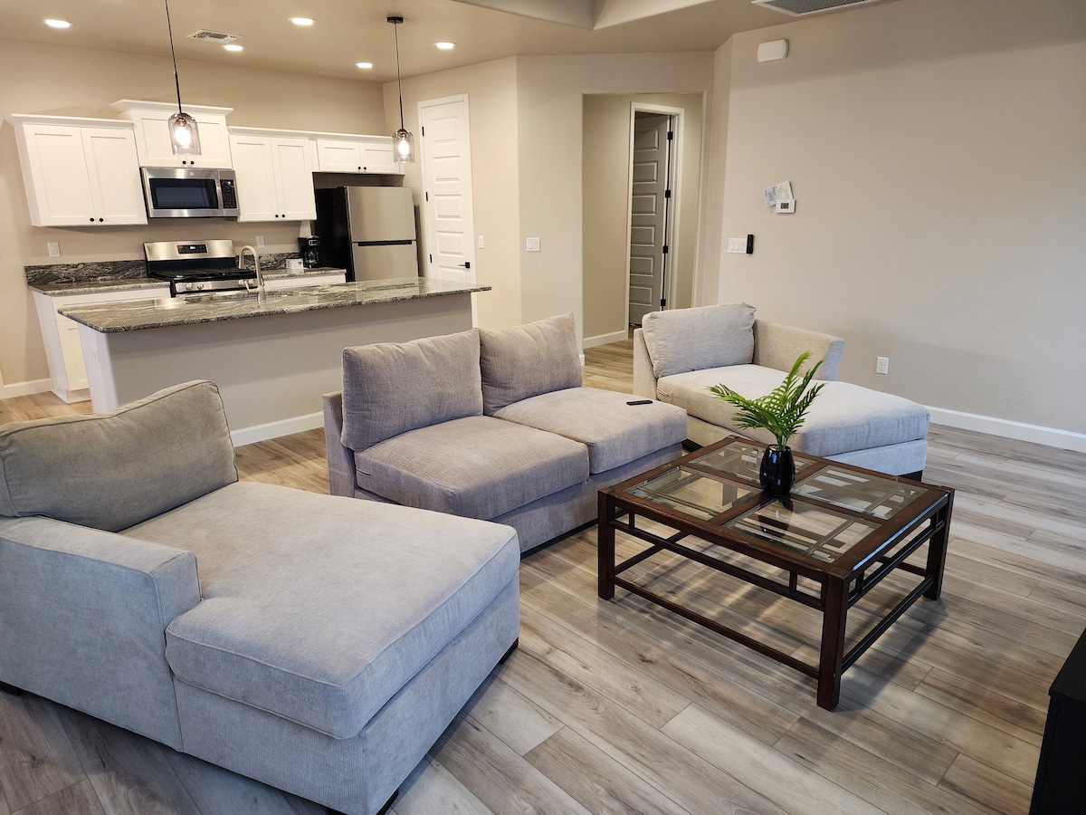 NEW!!! PET FRIENDLY!! This 1 bedroom 1 bath home sleeps 4 and sits in a perfect location just minutes from the regional medical center, I40, Route 66 and Historic Downtown Kingman. The home is also very close to many popular restaurants, local golf course and even Starbucks. What separates this home from others in the area is that you have your own yard, dog run, washer and dryer and all eating and drinking utensils along with a full size fridge. gas outdoor BBQ, Smart TV etc.