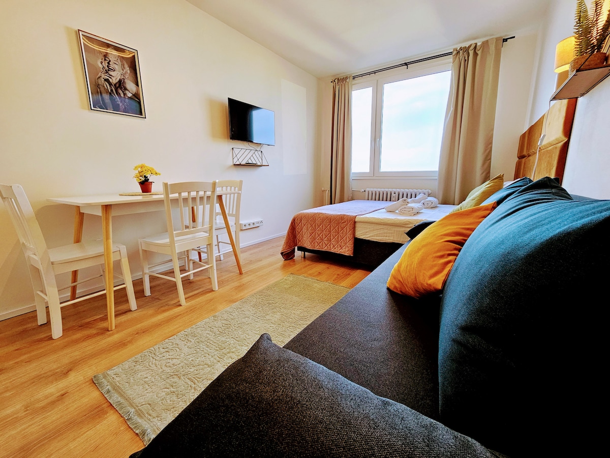 Apartamento tipo estudio moderno, acogedor y súper limpio de fácil acceso al casco antiguo de Praga (15 minutos). Llegada autónoma (a partir de las 5:00 p. m. o antes según la solicitud). WIFI (50 Mb/s), NETFLIX, café y té de forma gratuita. A 5 minutos a pie de la estación de tranvía (a continuación, a 15 minutos del centro antiguo). A 10 minutos a pie de la estación de metro (a continuación, a 4 minutos del centro antiguo). 1 doble malo (200 cm x 160 cm), cocina equipada. 1 baño con esquina de ducha, inodoro,lavadora (secador de pelo).