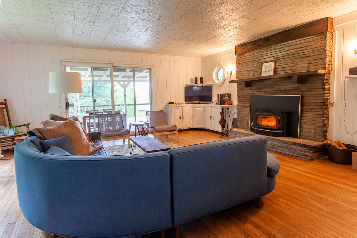 Moderno bungalow de estilo escandinavo frente al río en 8 acres. Siéntate en tu terraza con luces parpadeantes para tomar café/cenar lleno de sonidos y vistas de un río caudaloso; ¡cruza el río hasta tu propio lugar de baño privado! Perfecto para un retiro en la naturaleza, senderismo, natación, pesca (abastecido cada abril), esquí, trabajar con vistas a la montaña o escribir esa novela que siempre has querido terminar. A 2 horas del puente George Washington. Cargador de vehículos eléctricos de nivel 2. El odio no tiene cabida aquí, todos son bienvenidos.