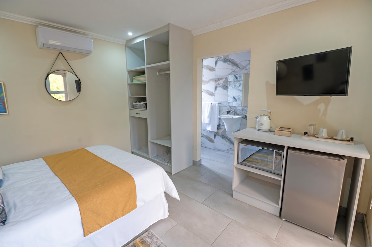 La habitación Comfort Queen cuenta con una cama tamaño queen y una ducha en suite. La cocina pequeña totalmente equipada incluye microondas, hervidor y nevera de bar para tu comodidad. Disfruta del entretenimiento en el televisor inteligente con DStv. El patio ofrece vistas serenas al jardín.
