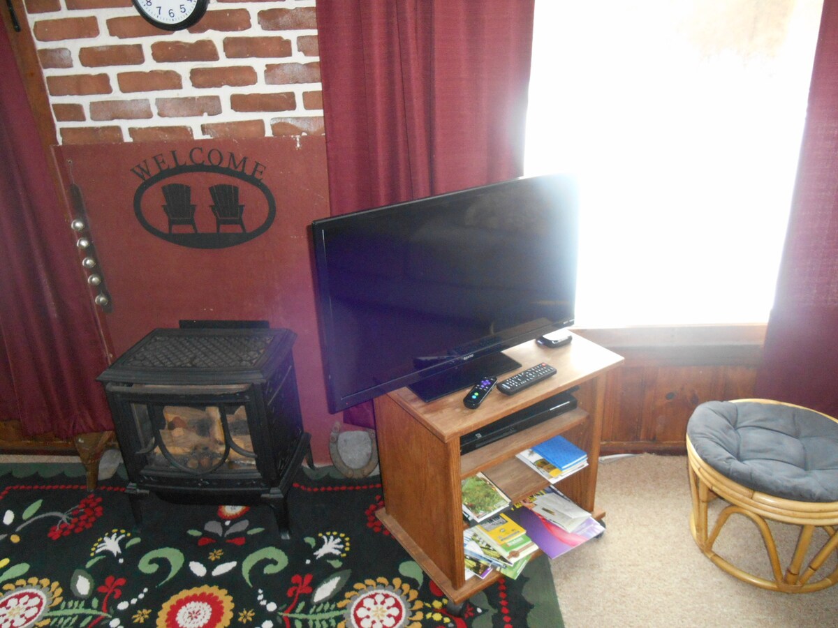 The "Rustic" cottage is furnished with a queen bed, sofa and dining table. There is a small deck with patio furniture, fire ring with wood supplied, and a gas barbecue. It can accommodate 2 people comfortably. Private with parking. Host in separate house. Wi Fi from Xfinity, but please note that it can be patchy. Roku TV WI FI connected to router.
