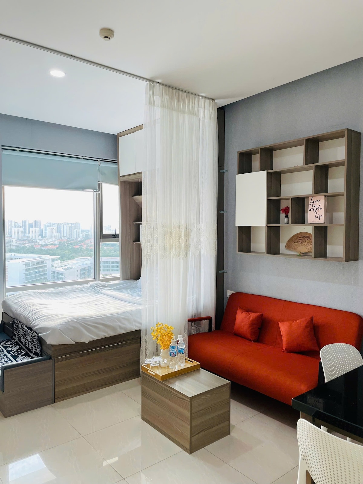 El apartamento estudio con un gran balcón con vistas a la ciudad se encuentra en el edificio Sunrise Riverside en el sur de Saigón. Debajo del departamento, está Starbuck Coffee. Solo te tomará unos minutos ir al centro comercial (Vivo City) y al centro de exposiciones (secc). Además, hay muchas tiendas y restaurantes convenientes (7-Elevent, Family-mart, K-Mart, BBQ, Hotpot...) Hay un servicio de limpieza gratuito para reservaciones de más de 3 noches. Si es necesario, puedes avisarte con 1 día de antelación.