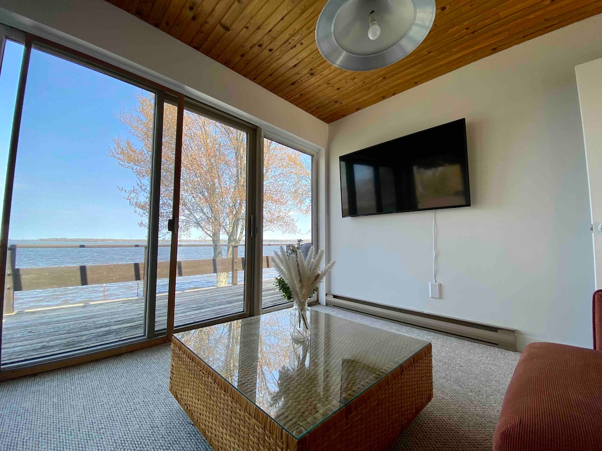 Alojamiento completo con vistas al río Nicolet, el lago St-Pierre y el río San Lorenzo. El apartamento consta de 2 dormitorios con camas dobles, así como 2 sofás cama doble, así como todo lo necesario para alojarse. Terraza exterior, acceso a la parcela, chimenea exterior y la oportunidad de utilizar kayaks y una canoa. Además, es posible amarrar su embarcación en el muelle que se encuentra al final del patio para disfrutar del agua e ir a pescar su cena. Garaje disponible