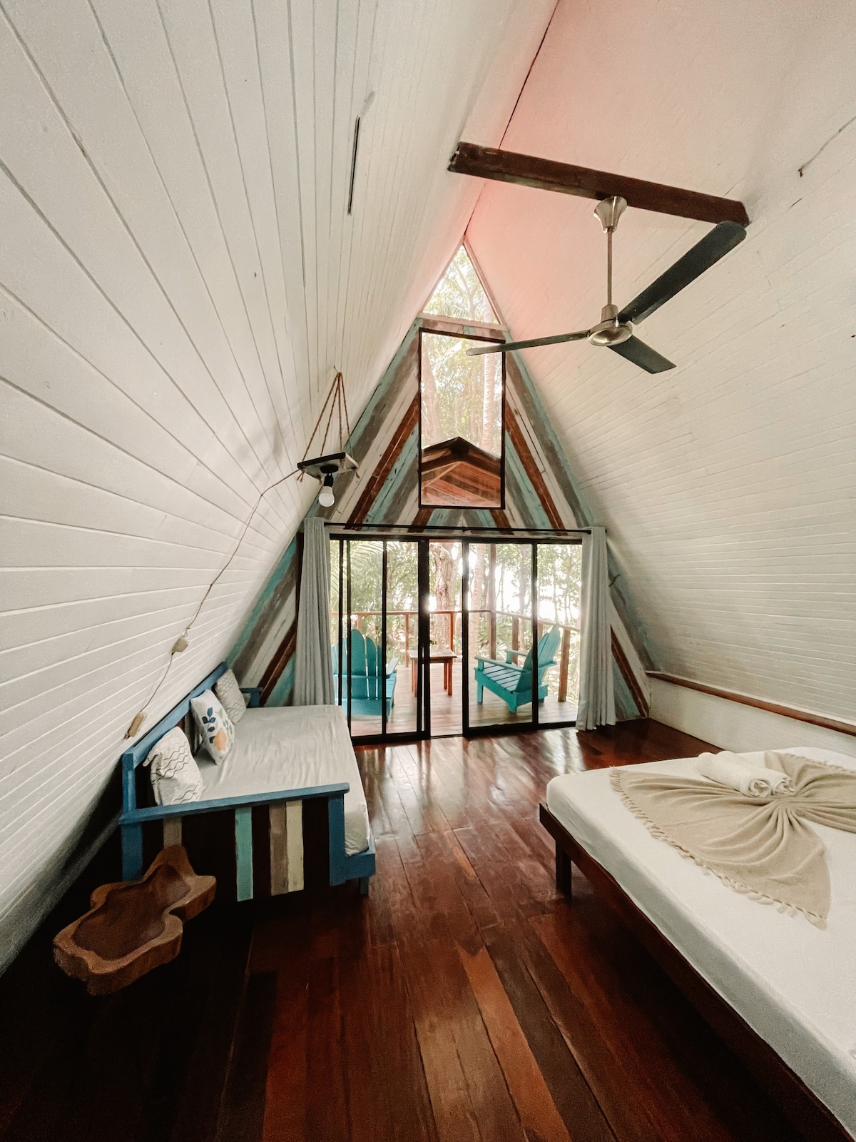 La cabina cuenta con una habitación en el piso superior con una cama king y dos camas unipersonales. La habitación cuenta con salida a un balcón privado con vistas al jardín. En el piso de abajo se encuentra el baño con ducha, un espacio con mini refri y galería externa con sillas, mesa y hamaca para relajarse y descansar. La cabina se encuentra a sólo unos metros de distancia de la piscina y de la playa.