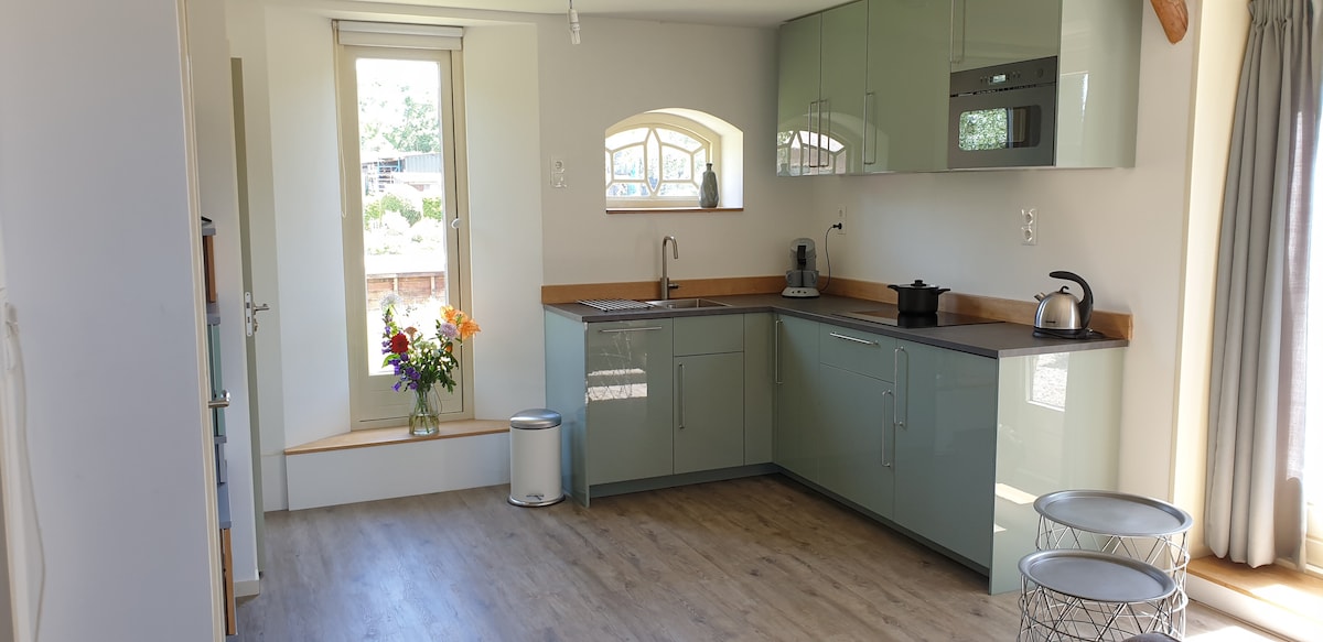 Nuestro B&B está equipado con todas las instalaciones modernas, como una cocina moderna, iluminación Philips Hue, TV inteligente y Quooker. La acogedora terraza se completa con un jacuzzi de lujo y una estufa de leña. El B&B, con un gran jardín privado y vistas despejadas, está completamente separado de la granja por una valla y solo es accesible para usted como huésped. Desde la sauna finlandesa de barril en la terraza contigua se puede contemplar las pintorescas praderas de la ciudad. Un delicioso desayuno a su gusto es opcional.