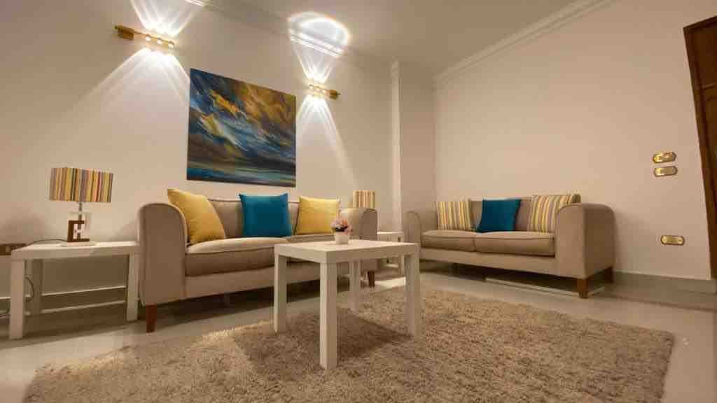 (No se permiten parejas solteras, disfruta de la comodidad y el estilo en este apartamento moderno bellamente amueblado, diseñado para ofrecer una estancia relajante. El espacio cuenta con una decoración contemporánea, acabados de alta calidad y todo lo que necesitas para una estancia perfecta. Cerca de la Escuela Internacional Francesa Carfoure, del centro comercial Hub 50. A 5 minutos de la carretera de circunvalación, Mehour El Kafrawy llega pronto a cualquier ubicación en El Cairo al distrito cinco del centro de la ciudad y a la carretera Autostorad. Cerca de Lycee Francine, escuelas Privilege.