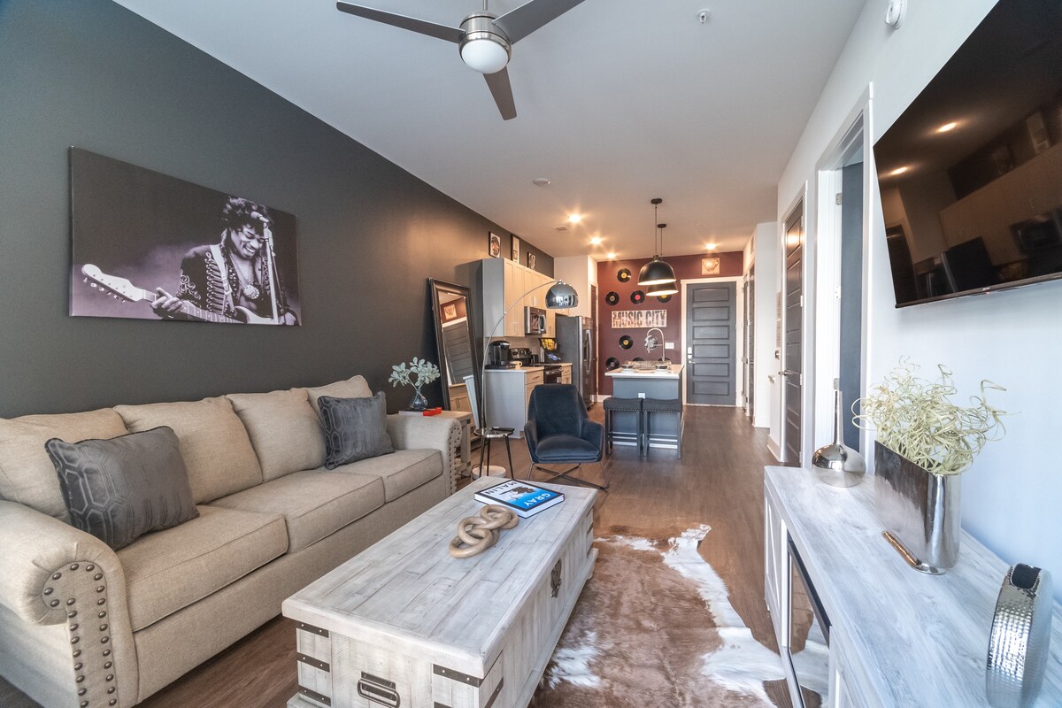 *PREGÚNTANOS POR NUESTROS DESCUENTOS INTERNOS* ¡Vamos a Nashville con estilo! ¡Disfruta de una experiencia tranquila pero elegante en este lugar céntrico y muy cerca del corazón del funky honky tonky! ~ Ubicación privilegiada en el centro ~Piscina de agua salada - Techos altos y vistas INCREÍBLES. - Gimnasio ~lavadoraYsecadora ~ TV inteligente *Caminara* -5 minutos -›Music City Center, Music Hall of Fame, Martins Bar-B-Que Joint - A 10 minutos de Printers Alley, Bridgestone. *En auto* 5 minutos -›The Gulch A 5 minutos del estadio Nissan. 10 min -› Aeropuerto de Nashville ✈️