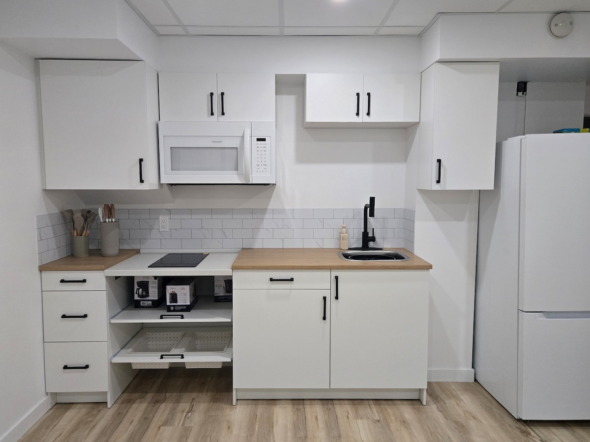 ¡Buscas un lugar de escapada, privado, silencioso y tranquilo! Apartamento de 1 dormitorio en el sótano con un lado de cocina que viene con nevera, microondas, hervidor de agua, cafetera, cubiertos y utensilios básicos para tu uso. La habitación está equipada con un escritorio y una silla de lectura ajustables, una cinta de correr para hacer ejercicio y una cama tamaño queen que es cálida y acogedora para un sueño perfecto. Se proporcionan toallas frescas y limpias. Se encuentra en un entorno sereno de la ciudad con un sistema de autobuses de tránsito funcional.
