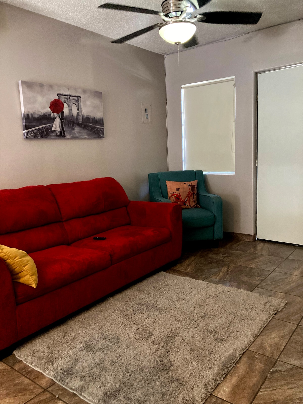 Estudio Loft al sur de Nogales Sonora, ubicado en Residencial con acceso controlado, a 3 min. del nuevo IMMS, 15 min de USA, 10 min. del Consulado & del Centro comercial. Ubicado en un segundo piso, cuenta con WIFI, cama King size, cocina equipada, televisión, refrigerador, minisplit, calefacción, abanico de techo, regadera con agua fría y caliente, baño completo, ventanas y balcón, acceso independiente, además de cerradura electrónica. Estacionamiento dentro del residencial.