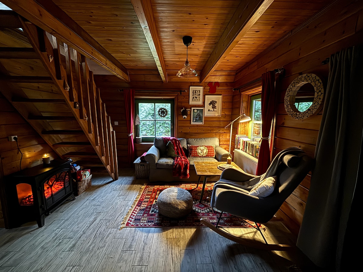 Acogedora cabaña de madera con chimenea y vistas al Danubio