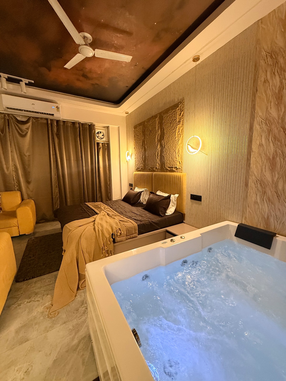 Apartamento estudio de lujo diseñado para la comodidad, la privacidad y la relajación. Con un jacuzzi privado en la habitación, interiores elegantes, iluminación cálida y una acogedora cama tamaño king, este espacio es perfecto para parejas, celebraciones o una escapada tranquila a la ciudad. Ideal para estancias románticas, cumpleaños y aniversarios, el estudio ofrece un ambiente limpio y moderno con comodidades esenciales para una estancia tranquila e inolvidable. Relájate, descansa y disfruta de una experiencia prémium.