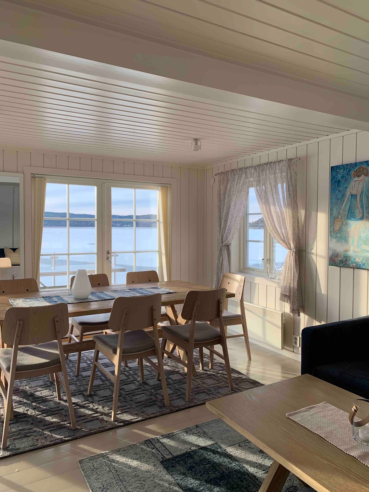 Kök och allrum med 155 cm dagsäng och havsutsikt. Stort sovrum med 160 cm dubbelsäng. Kök med ugn/induksjonshäll, kyl/frys, disk och micro. Bad med dusch, tvättmaskin och torktumlare. Altan och stor uteplats med gräs. Parkering utanför. 10 minuters gånge til vattnet med stränder, klippor och båthamn, skogen 1 minut bakom huset. 15 min att köra til centrum, 10 minuter til Nordby shopping. 20 minuter till Koster med båt. Lugnt område.