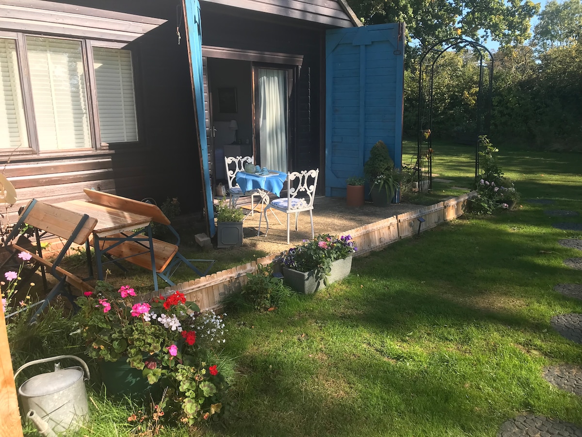 Our new Garden rooms are light and calming, backing onto fields.Deer, pheasants and barn owl’s can be seen most days.There is a patio at front and at the back where enjoy the view and also a BBQ available to cook your own food. We also have a Scandinavian BBQ HUT where our guests are welcome to spend a private evening of a cost of £20..There is lots of wildlife to be seen here and deer in our woods. Shops are 10 min away but a nice pub/restaurant 4 minutes by car. The trundle bed is 6ft !