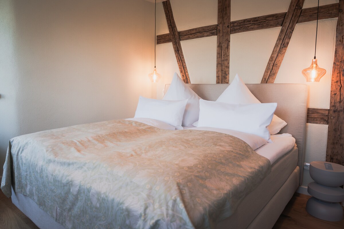 This stylishly furnished apartment awaits you with fresh coffee or tea, a cozy king-size box-spring bed and a view of the imposing rock face of the Rotenfels. It is the perfect base for a break close to nature for groups, families and business travelers. Here you can go hiking, cycling or simply relax over a glass of wine. Even on poor weather days, entertainment is provided with a selection of board games and books.