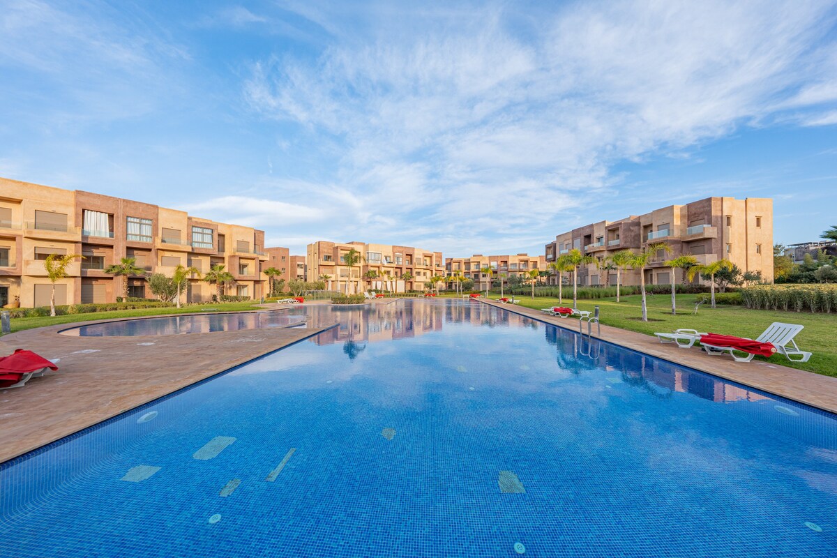 Escápate a este impresionante apartamento de lujo en la famosa residencia de golf Noria de Marrakech. Disfruta de una vista cautivadora de la piscina brillante y la comodidad de un espacio de trabajo dedicado con wifi de fibra ultrarrápido. Perfecto para familias, trabajadores remotos y grupos de amigos. Capacidad para 5 personas en 2BR/2BA. Ofrecemos servicios premium que incluyen lavadora/secadora, Nespresso/freidora de aire, estacionamiento seguro gratuito, cuna para bebés. A solo 10 minutos del aeropuerto y a un corto viaje en taxi de la antigua Medina y el centro de la ciudad de Gueliz.