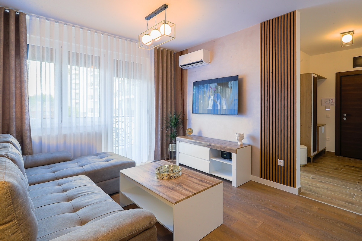 Modernly designed apartment ideal for couples or business travelers who want comfort, peace and proximity to the city. A spacious living room with a comfortable sofa, a smart TV and a work desk, ideal for relaxation or a productive work environment. Fully equipped modern kitchen with all necessary appliances and utensils for preparing meals. A comfortable bedroom with a double bed and luxurious bedding. Discreet ambient lighting contributes to a relaxing atmosphere.