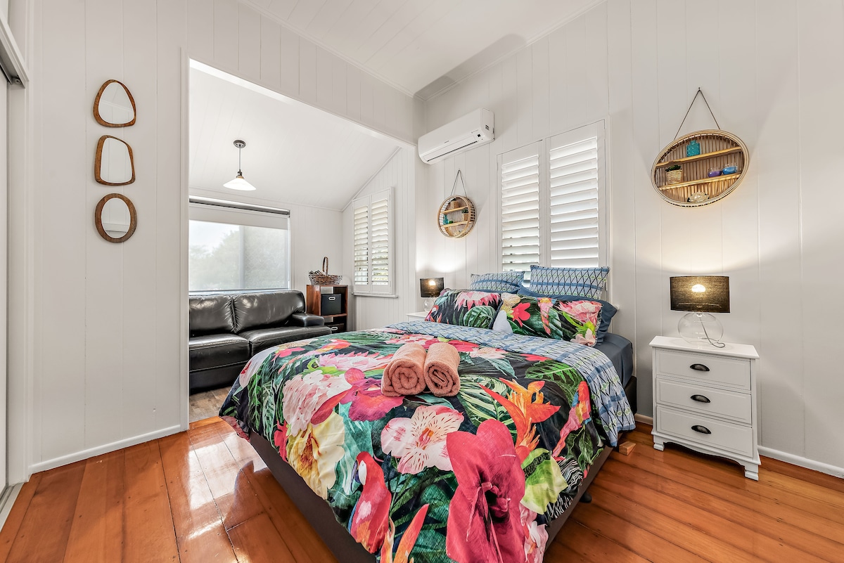 Escape to our trendy studio retreat! Perfect for solo travellers or couples, it features a cozy queen bed & air conditioning. Your stylish bathroom is just a few steps across the courtyard in the adjacent building. Enjoy convenient amenities like a washing machine, mini-fridge, microwave/toaster/kettle. Relax in our garden paradise under the covered courtyard or pergola. Plus, there's shaded parking. We're conveniently located minutes from the CBD, highways + shopping. We can't wait to host you!