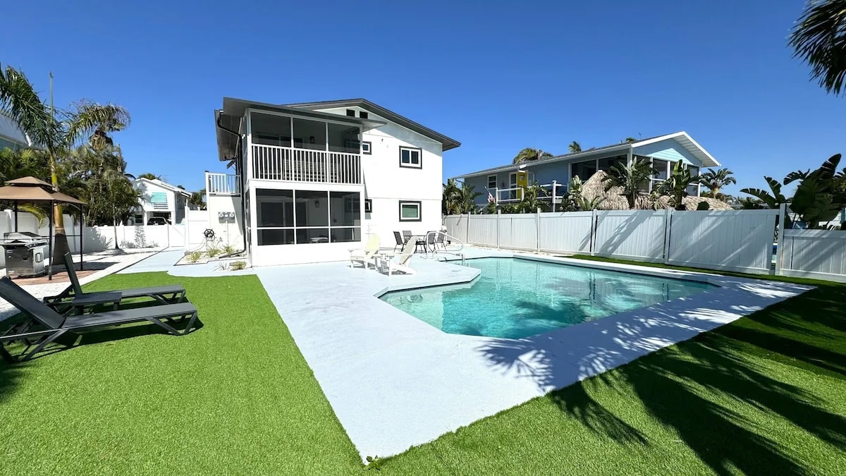 Bienvenido a tu casa de vacaciones de ensueño: un impresionante oasis de 5 dormitorios y 4 baños frente al canal a pocos minutos de las suaves arenas de Fort Myers Beach. Piscina de agua salada climatizada, jacuzzi para 8 personas, dos kayaks y bicicleta. ¡Juegos divertidos para familias: shuffleboard, ping-pong, mesa de billar y baloncesto en la piscina! Ubicado directamente en un canal del golfo, puedes ver delfines y manatíes en tu patio trasero. Está a solo 4 minutos a pie de la playa para algunas de las puestas de sol más increíbles que hayas visto en tu vida.