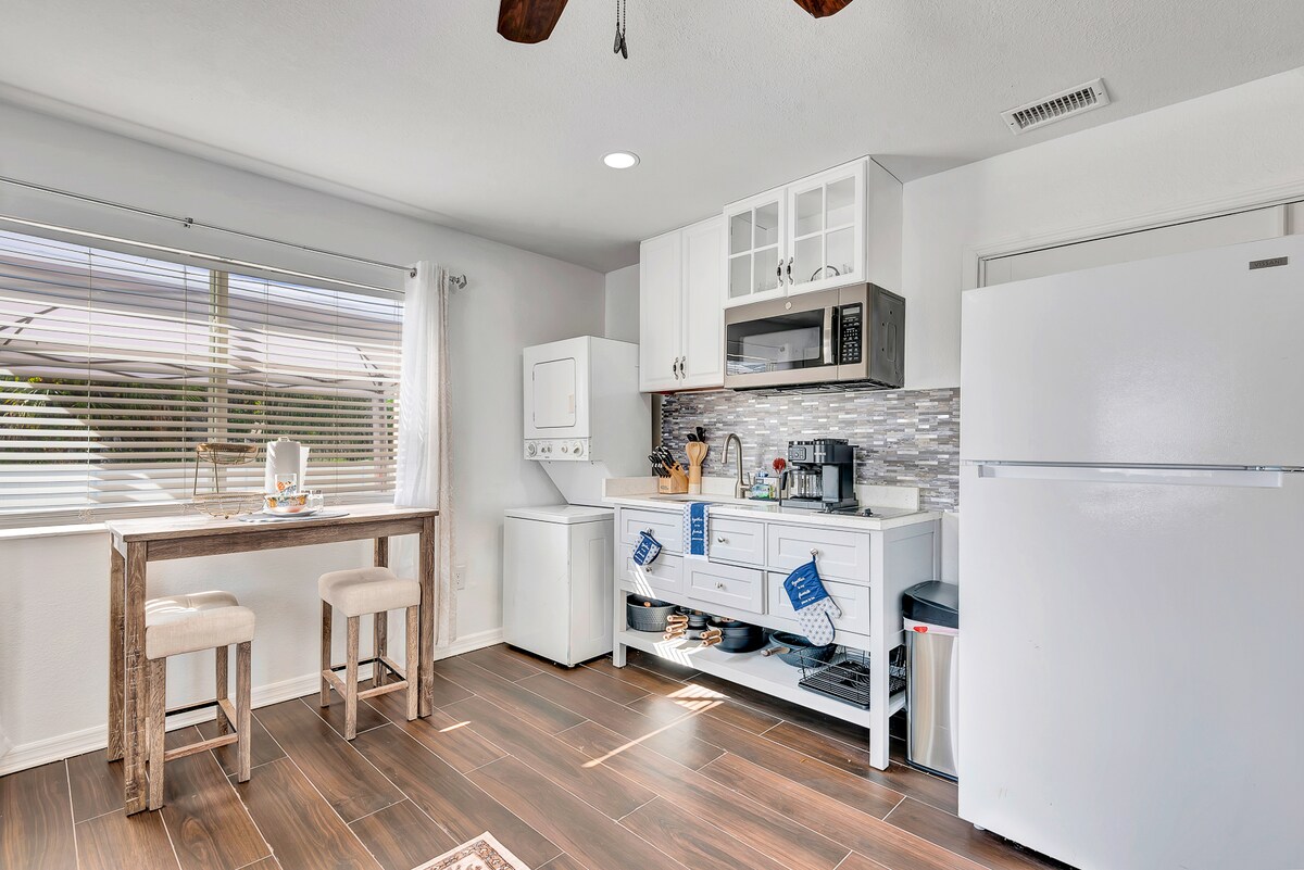Empieza bien el día con una taza de café mientras observas a los pájaros y las ardillas jugar en nuestro tranquilo patio trasero. Tendrás una entrada privada y una plaza de aparcamiento, así como todo el estudio para ti. Estamos ubicados a 2,5 millas de las arenas de Venice Beach y a 2,5 millas de la ruta 75 y del centro de Venice. Disfruta de todas las comodidades del hogar con Roku TV, internet de alta velocidad, cama tamaño queen, utensilios de cocina, toallas de playa y sillas. Una lavadora/secadora disponible bajo petición con estancias de 3 días o más.