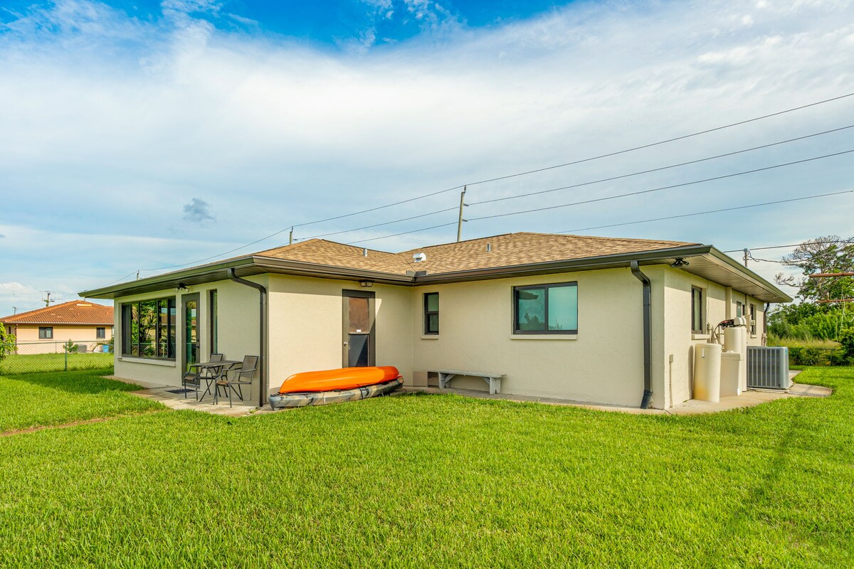 Disfruta de tu propia suite de 2 habitaciones en este encantador barrio aislado. Los suelos de bambú y la madera de colores claros hacen que tu espacio sea luminoso y alegre. El patio trasero cuenta con una cabaña tiki de 2 pisos, hamaca, chimenea y muelle para tu relajación. Llega por tierra o por mar. El canal de acceso para veleros está a solo 300 yardas del río Peace y el muelle tiene alimentación de 110 V. La casa está al final de una calle sin salida con una gran área abierta frente a la casa.