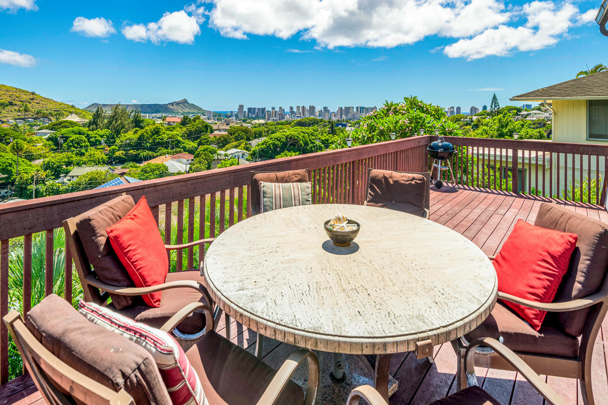 A tu familia le encantará este encantador dúplex de 2 dormitorios, ya sea que haya solo dos o un grupo tan grande como cinco. La casa también admite mascotas (por una tarifa adicional de $250), lo que es difícil de encontrar. Los toques únicos de Craftsman incluyen ventanas de vidrio teñido personalizadas junto con una ducha al aire libre que proporciona mayor comodidad después de un día de playa. Encuentra un segundo espacio de estar completo en el lanai cerrado con vistas panorámicas de Diamond Head y la ciudad de Honolulu.