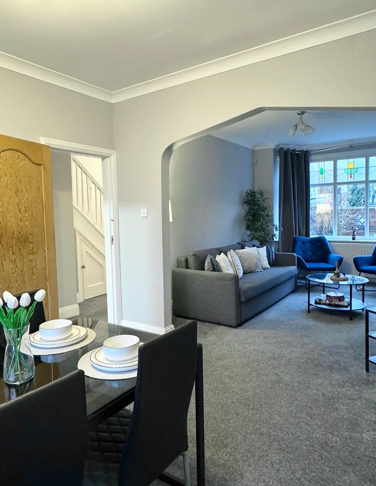 Retiro de lujo en el frondoso New Walk con vistas panorámicas a la Plaza del Museo desde el salón y la cama tamaño king a través de ventanas de guillotina. Cafetera y cocina totalmente equipada, apta para hacer una cena completa en inglés o asado, disfrutada en la barra del desayuno o en la mesa del comedor. Disfruta de un televisor 4K de 65 pulgadas con Netflix. Disfruta de una iluminación suave y una potente ducha. A solo 5 minutos de la estación, camina hasta De Montfort Hall 10, Curve 8 y Tigers Stadium a 12 minutos. Un refugio tranquilo y elegante justo en la joya de Leicester, New Walk 🍃