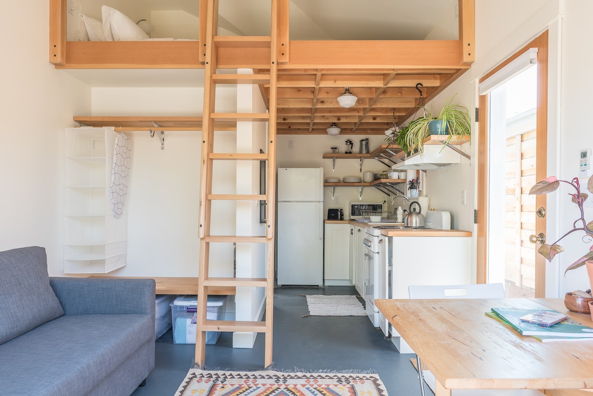 Close to the airport, Alberta, Hollywood, Concordia, and Mississippi Districts, this loft studio is perfect for tiny house living in the city. Queen Tuft & Needle bed in the loft is reachable via custom-crafted ladder. The main floor has a fully-functional kitchen with a whimsical vintage stove and reclaimed touches. The spacious bathroom includes tub/shower combo with subway tile. The seating area includes room for a queen sofa bed and small dining table - try tiny house living here!