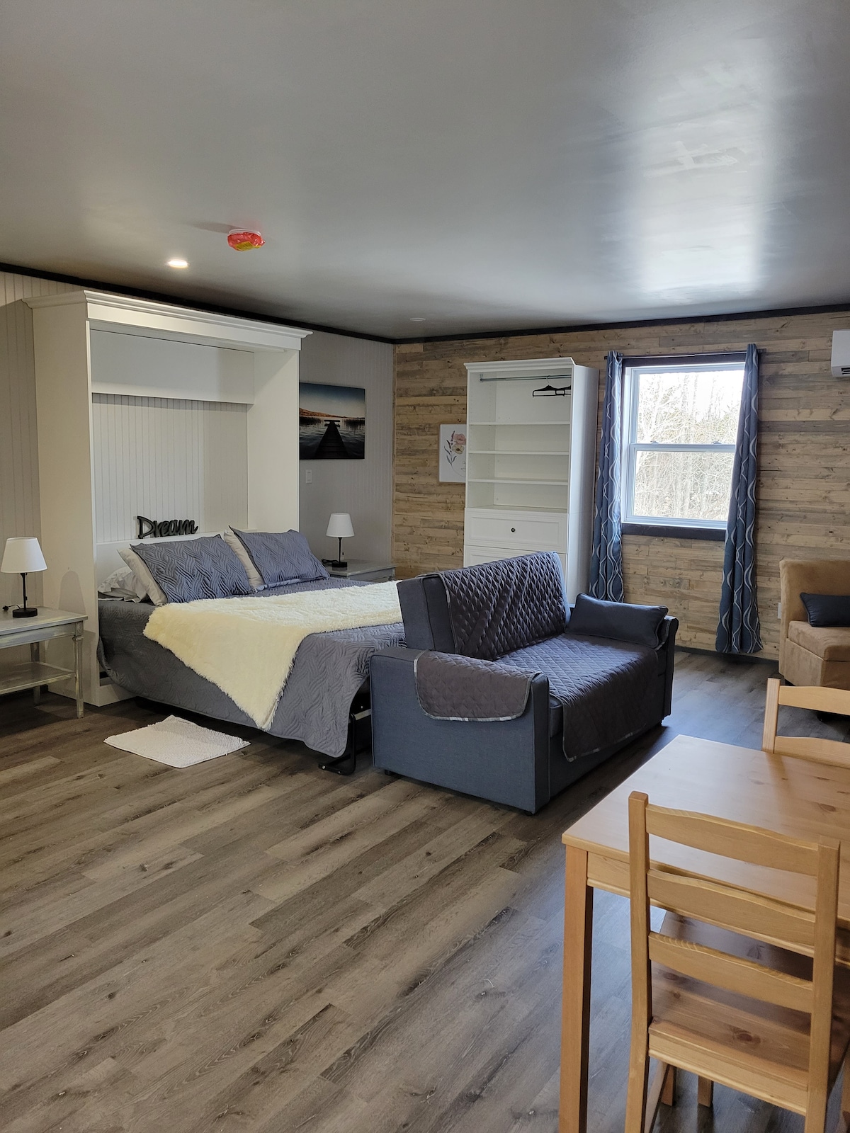 Acabamos de agregar una nueva bomba de calor. Ofrecemos un loft de 700 pies cuadrados, tiene una cocina nueva, estufa nueva, nevera, microondas, tostadora, cafetera, platos, ollas, sartenes, etc. Nuevos pisos de madera en todo el loft y cerámica en el baño. Dormitorio con una cama queen size. Una cama doble escondida y una cuna individual. Un baño de 4 piezas recién reformado. Una sala de estar con 2 asientos de amor, una silla y una televisión. Agregamos un enfriador de agua y agua embotellada. Estamos a 3 minutos de la playa de Aboiteau.