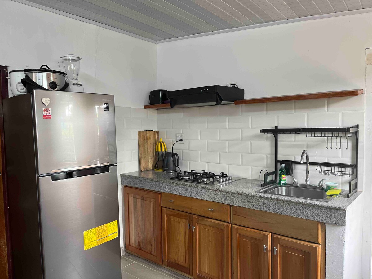 Pequeña casa en el centro de Volcán, totalmente amueblada, equipada con cafetera para que puedas moler y preparar tu propia taza de café local. Cuenta con asientos reclinables para tu comodidad donde podrás disfrutar de la app Roku ya sea para Netflix o la app Moviesanywhere cerca de restaurantes y el supermercado principal Romero, subir al volcán Barú, ir a la cercana localidad de Cerro Punta famosa por sus "fresas con crema" o visitar una de las fincas cafeteras locales donde se produce el mundialmente famoso café geisha.
