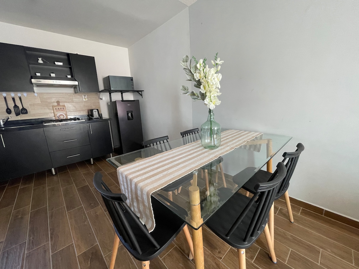 Hospédate con nosotros y vive una maravillosa experiencia al venir a Guanajuato, el departamento está construido sobre la peña, cuenta con una cochera techada y excelente vista panorámica tanto en su interior como en sus terrazas (techada y al aire libre) exclusivas para tí . Encontrarás iluminación natural, comodidad y estilo para que pases una experiencia increíble con tu familia, pareja o amigos, incluso para viajes de trabajo; ¡el ambiente de este departamento es inspirador!