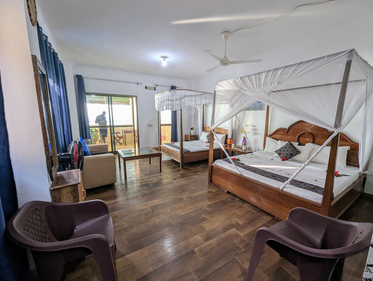 La habitación familiar con cama doble es una habitación única de su tipo con habitación doble en una habitación. Esta habitación da privacidad a los miembros de la familia debido a su singularidad de la habitación de dos camas dentro de una habitación. Es una habitación de hotel frente a la playa con vistas exóticas del agua azul limpia del océano Índico de Zanzíbar. Puedes ver el Sun Set desde esta habitación. También tiene una bonita zona privada para sentarse fuera de la habitación y relajarse.