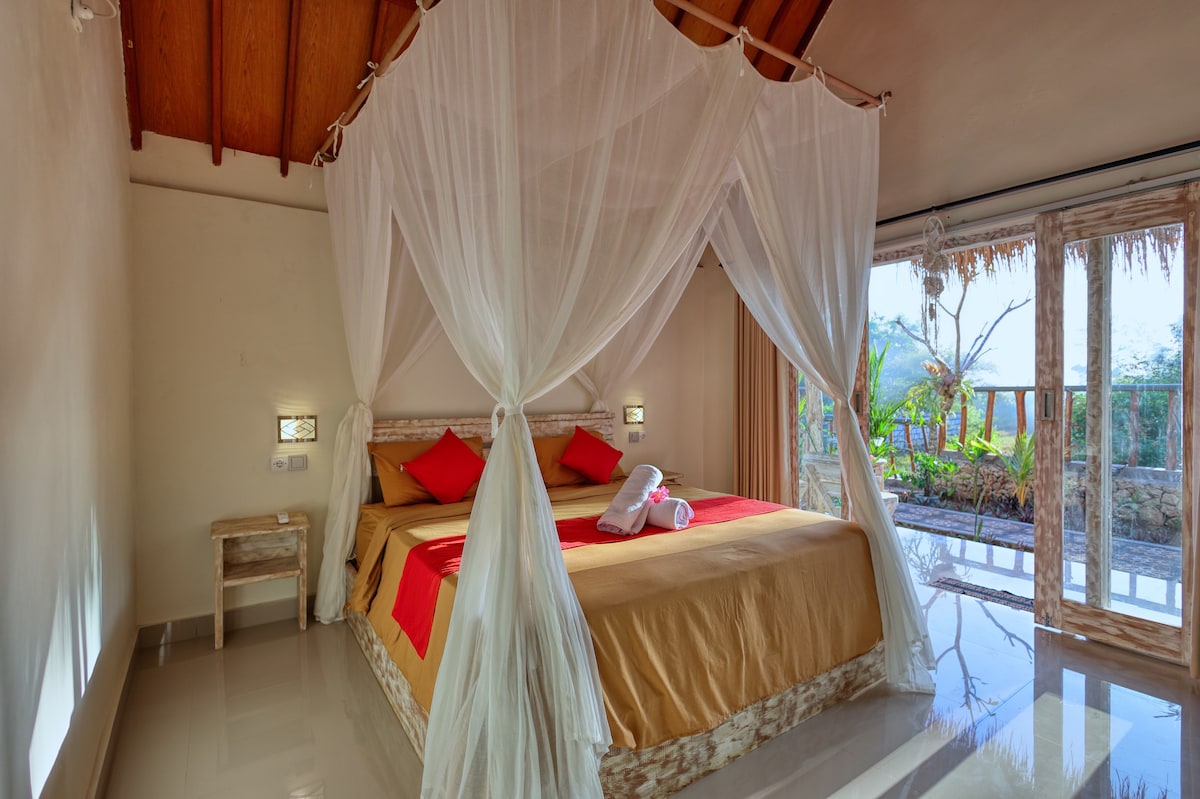 Garden View at Peaceful Hill Penida is a cozy tropical cottage surrounded by lush greenery, offering stunning views of the garden and peaceful hills. Designed with natural bamboo elements and modern touches, it provides a tranquil escape perfect for couples or solo travelers. Located just a short drive from Nusa Penida's must-visit spots like Kelingking Beach and Crystal Bay, it’s an ideal base for exploring the island or simply relaxing in nature.