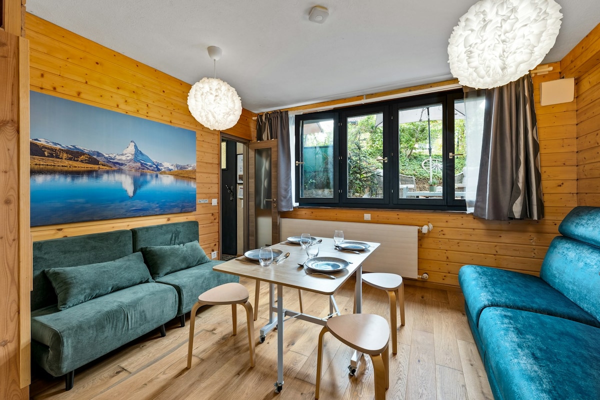 Estudio totalmente equipado. Acogedor con su espacio de 22 m2 ofrece una sensación de confort atemporal creado para momentos especiales y una estancia tranquila. Su cama doble de 140x200 cm garantiza un sueño de calidad. A petición previa, 1 espacio de estacionamiento de pago está a su disposición al pie de la casa. El precio es de CHF 10.-/noche. El pago se realiza a más tardar el día de llegada del Guest. Medios de pago: Efectivo o a través del centro de resolución de Airbnb.