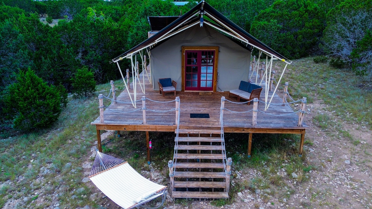 Safari ✧aislado de 5 acres: un refugio aventurero dentro de un refugio de animales exóticos de 1700 acres. Tienda ✧glamping: totalmente aislada, con aire acondicionado y calefacción para una comodidad durante todo el año. Acceso al✧ río a solo 3,5 millas de la tienda: lugar privado en el río Lampasas para pescar, hacer kayak y observar la vida silvestre. ✧Observación de estrellas en una zona de cielo oscuro: relájate bajo las estrellas de Texas con hamacas, asientos en la terraza y un pozo para fogatas. Confort ✧sostenible fuera de la red: alimentado por energía solar al 95 %, con carga de vehículos eléctricos de nivel 2 y agua de lluvia purificada fría y caliente.