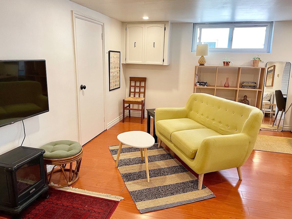 Forget your worries in this spacious and serene space. Peaceful neighborhood in central Toronto. This unit is everything you need. Perfect for couples. 700 sq ft, brand new furniture, transit-friendly and a 10 minute walk to a variety of restaurants and coffee shops. Transit will take you in Downtown in 20 min. Fresh linens, towels, Wi-Fi, coffee maker, toaster are provided. Guests have a private seperate entrance. I want people to feel comfortable in the space 6ft max height is recomended.