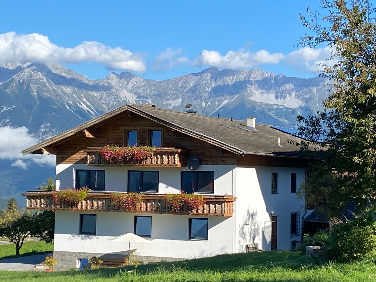 The WIESENHOF in Patsch near Innsbruck offers three high-quality APARTMENTS for your well-being vacation in the mountains. The 85m² Apartment HABICHT for 2-6 persons is located on the top floor with amazing views and furnished with solid, fragrant natural wood. Up to three double-bedrooms (each with private shower/WC) can be used. The private south-side balcony ensures a unique, breathtaking view over the magnificent alpine scenery of the Stubai Glacier and the beautiful natural surroundings.