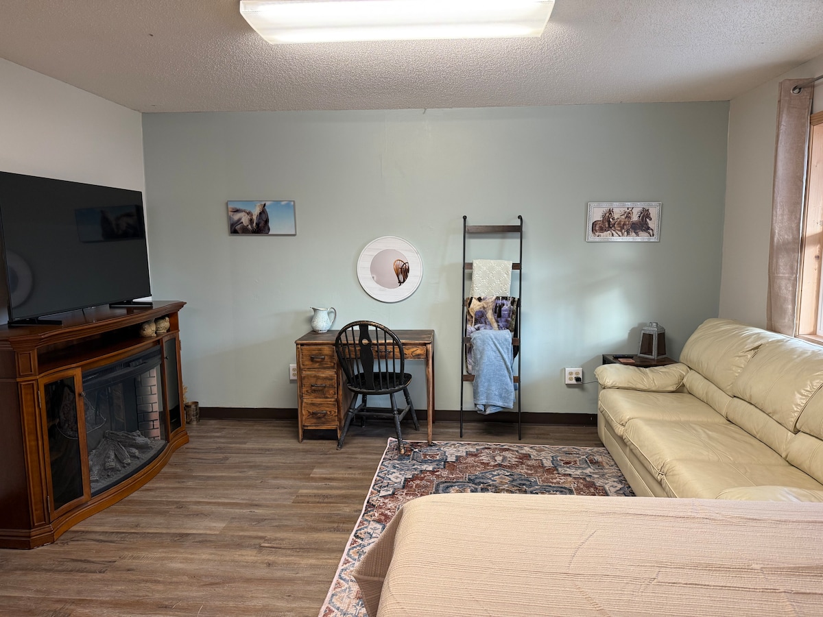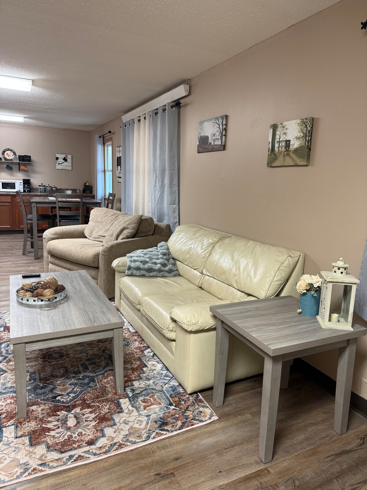 ¡Construcción recién construida! Disfruta de este acogedor apartamento de 1 dormitorio y 1 baño en el sótano con una elegante mezcla de diseño moderno e industrial de mediados de siglo. Las características incluyen paredes de color gris claro con detalles onyx, una sala de estar abierta con futón, mesa de comedor y cocina pequeña. Los pisos de hormigón y el baño con plantillas agregan un encanto único. El baño tiene un tocador de puerta de granero y una combinación de ducha/bañera. ¡El dormitorio tiene una chimenea eléctrica! ¡Perfecto para una estancia elegante y relajante!