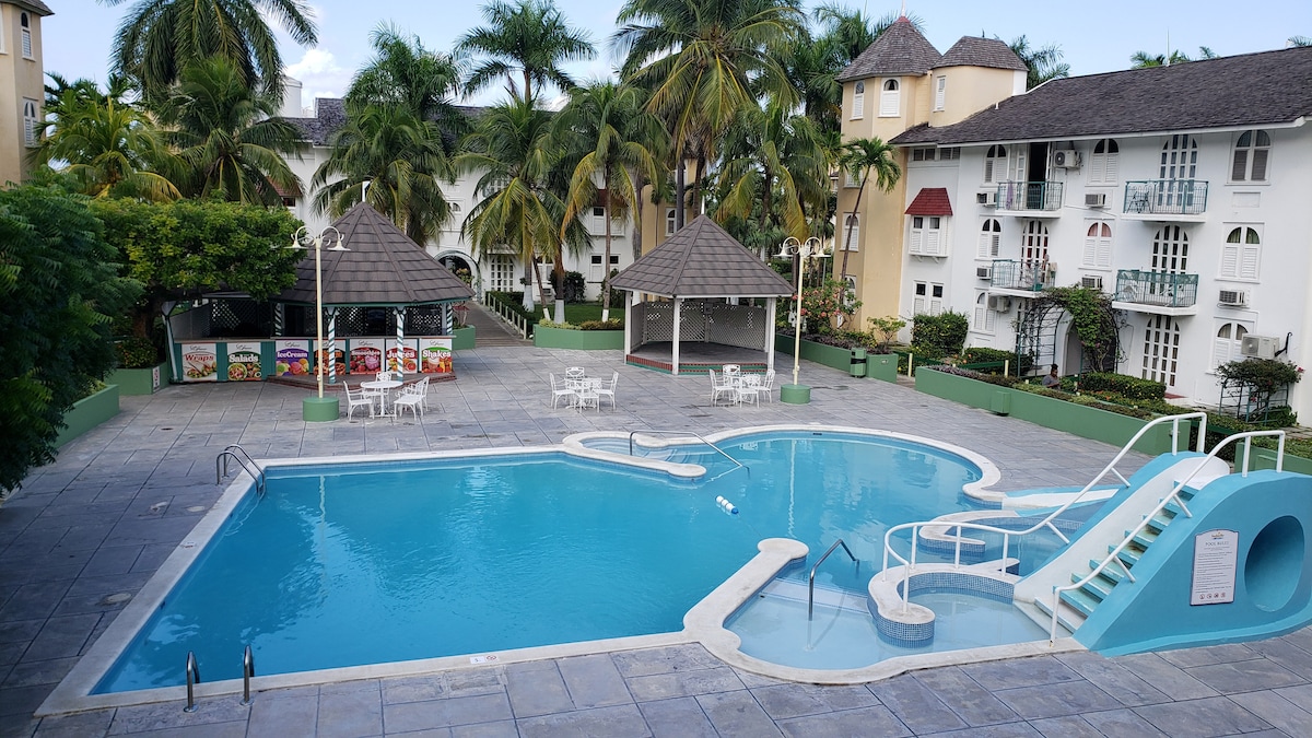 Publicación de Melissa: Todos los servicios públicos están funcionando. Moderno estudio junto a la piscina, vistas a la ciudad y al mar. Alexa Smart y entrada sin llave. Céntrico en Ocho Ríos, seguridad cerrada las 24 horas, Sky Castles, a 5 minutos en auto de atracciones (cascadas del río Dunn, Mystic Mountain) y tiendas. Azulejos de porcelana para una sensación de lujo. Cocina equipada, televisor inteligente, caja fuerte, ducha, 1 cama queen para 2 y un sofá cama para 1. El patio cubierto, el estacionamiento gratuito y el acceso a 2 piscinas hacen que esta sea una visita obligada. Hay una cámara encima de la puerta principal, esto es para la seguridad de los huéspedes.