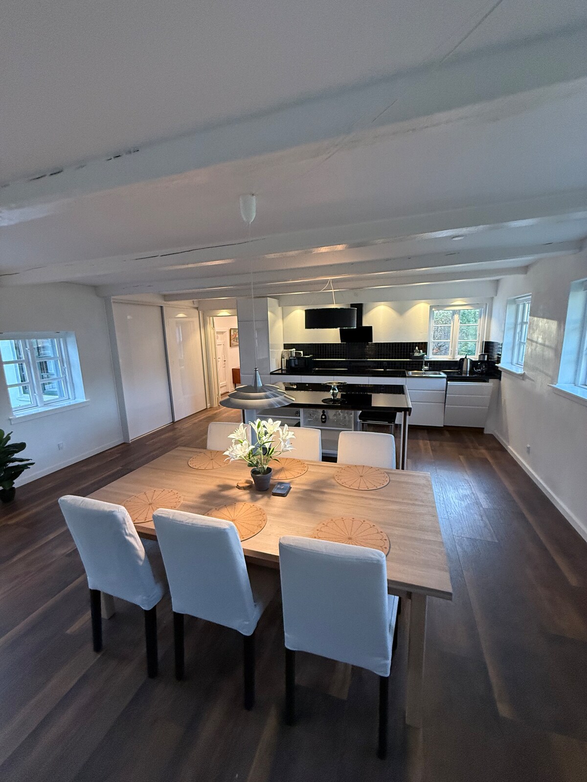 Esta encantadora casa antigua recién renovada de 1777 de 244 m² con 7 dormitorios rezuma encanto y tiene excelentes instalaciones para una o más familias. Jardín ajardinado orientado al sur con vistas al bosque y a los arroyos desde una terraza de 80 m2. Playa (900 m) y a 2 km de supermercados Nykøbing Sj., restaurantes, piscina, campos de golf (4500 m), Sommerland Sj. (4 km), etc. Sala de actividades con tenis al aire libre, etc. TV con 3 canales daneses. Red de fibra rápida y WIFI. Las sábanas y toallas están disponibles con cita previa.